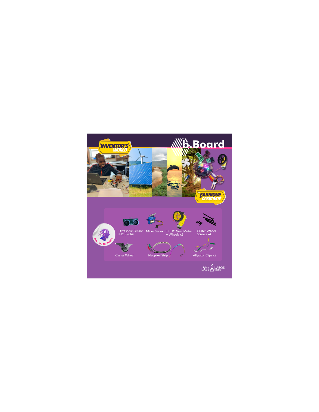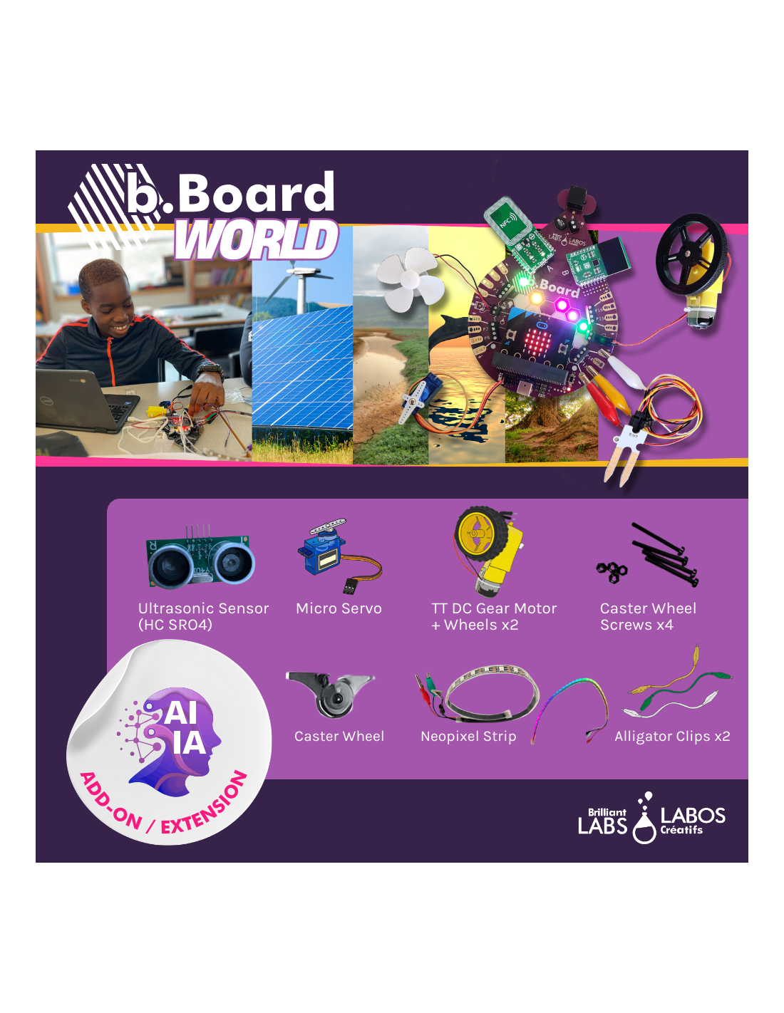 The b.Board AI Add-On Kit expands your b.Board learning experience into artificial intelligence, robotics, and automation. Designed to work with the b.Board Core Kit, it helps learners explore how machines can see, detect, and respond through creative, hands-on projects that combine coding, design, and intelligent control.